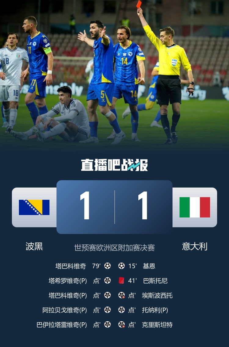 连续三届无缘世界杯!十人意大利点球大战2-5波黑 巴斯托尼染红