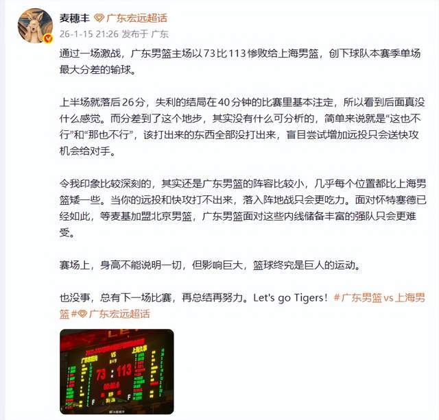 没想到吧,广东男篮坐镇主场,居然以73-113惨败给了上海队,输了40分之多,爆出一大冷门,令人汗颜!作为十一冠王,广东男篮目标是拿到总冠军的,没想到,在自己主场,面对豪门上海队,居然就被打了个底朝天。那么,广东队为何会40分惨败呢?赛后,广东媒体人麦穗丰老师给出答案,说得太实在了,杜锋还能咋地?